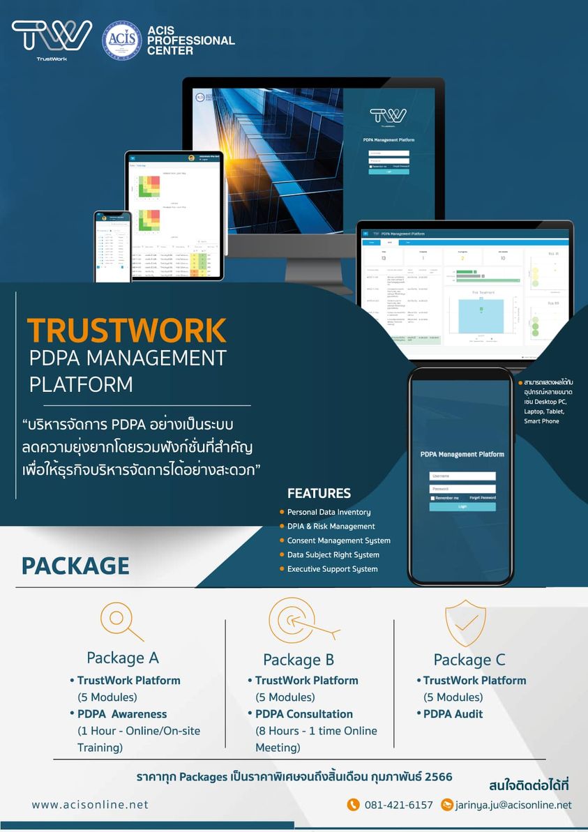 ACIS ได้สร้างชุดเครื่องมือเพื่อรองรับการนำ Data Privacy มาปรับกระบวนการภายในองค์กรให้เป็นไปตาม พ.ร.บ. คุ้มครองข้อมูลส่วนบุคคล พ.ศ. 2562 (PDPA) อีกทั้งสามารถสนับสนุนการเตรียมความพร้อมเพื่อ การรับรองมาตรฐาน ISO 27701 ภายใต้ชื่อแพลตฟอร์ม “TrustWork”องค์ประกอบหลักของ TrustWork
